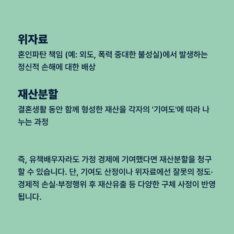 위자료는 혼인파탄 책임(예: 외도, 폭력, 중대한 불성실)에서 발생하는 정신적 손해에 대한 배상이고, 재산분할은 결혼생활 동안 함께 형성한 재산을 각자의 ‘기여도’에 따라 나누는 과정입니다.