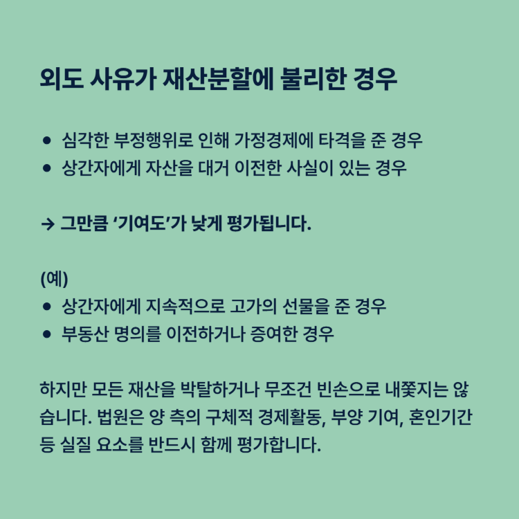 물론 외도 등 유책 사유를 만든 쪽은 현실적으로 재산분할 산정에서 불리해질 수 있습니다.