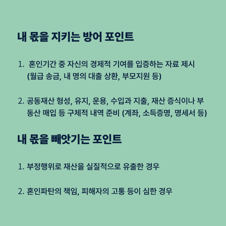 만약 외도 등으로 유책을 진 배우자라면 곧바로 포기하기보다는, 혼인기간 중 자신의 긍정적 경제적 기여—예컨대 전액 월급 송금, 내 명의 대출 상환, 부모지원 등—를 입증하는 자료를 적극적으로 제시해야 합니다.