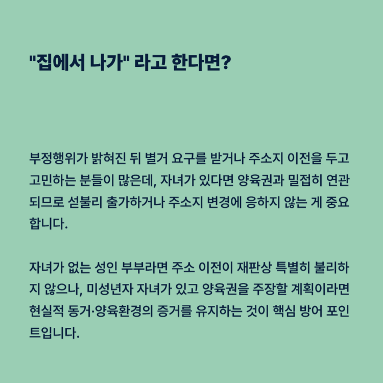 부정행위가 밝혀진 뒤 별거 요구를 받거나 주소지 이전을 두고 고민하는 분들이 많은데, 자녀가 있다면 양육권과 밀접히 연관되므로 섣불리 출가하거나 주소지 변경에 응하지 않는 게 중요합니다.