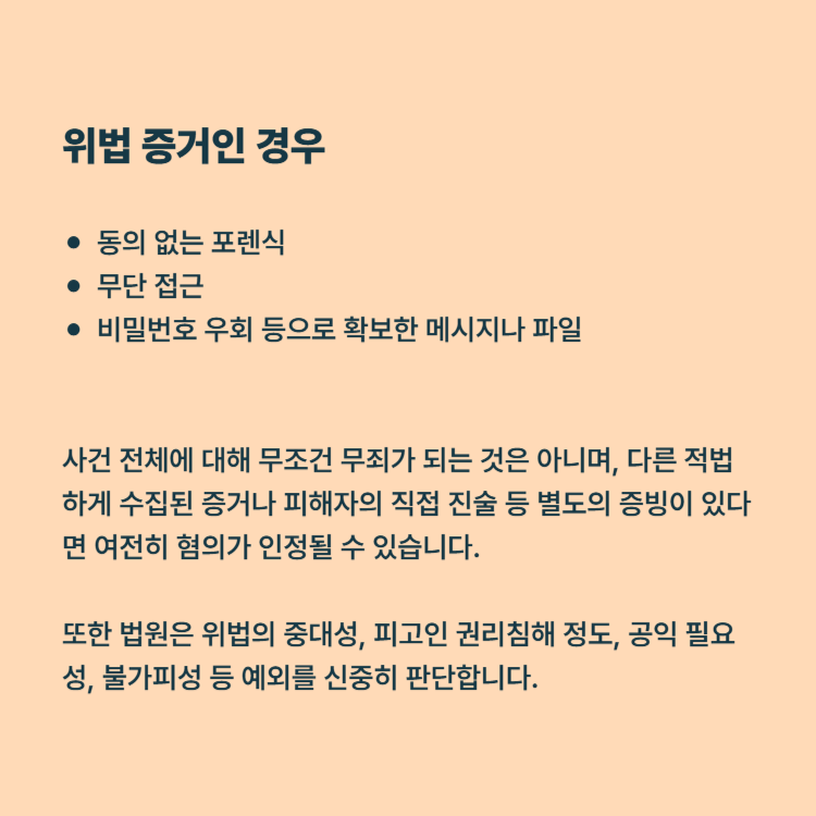 예를 들어, 동의 없는 포렌식, 무단 접근, 비밀번호 우회 등으로 확보한 메시지나 파일은 위법수집증거로 판단받을 수 있습니다.