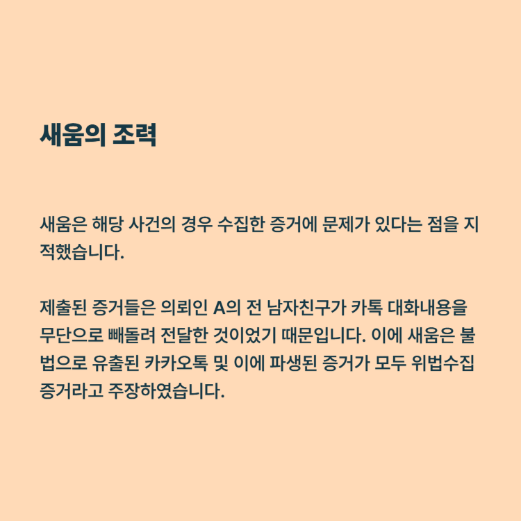 증거가 되는 것들은 A씨의 전 남자친구가 A씨의 카카오톡 대화내용을 무단으로 빼돌려 전달한 것이 발단이 된 것들이었기 때문에 불법으로 유출된 카카오톡 및 이에 파생된 증거가 모두 위법수집증거라고 주장하였습니다.