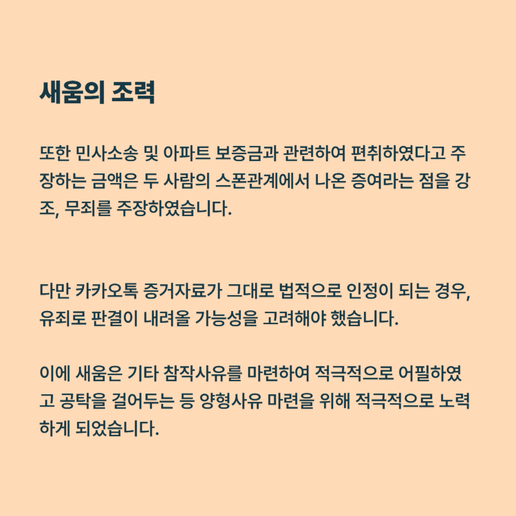 또한 민사소송 및 아파트 보증금과 관련하여 편취하였다고 주장하는 금액은 두 사람의 스폰관계에서 나온 증여라는 점을 강조, 무죄를 주장하였습니다.