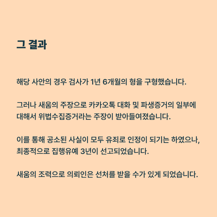 해당 사안의 경우 검사가 1년 6개월의 형을 구형하였는데요. 다만 카카오톡 대화 및 파생증거의 일부에 대해서 위법수집증거라는 주장이 받아들여질 수 있었습니다. 이를 통해 공소된 사실이 모두 유죄로 인정이 되기는 하였으나 최종적으로 징역1년 6월, 집행유예 3년이 선고되어 선처를 받을 수가 있게 되었습니다.
