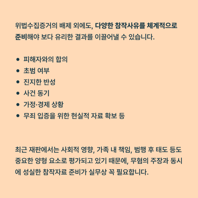 위법수집증거의 배제 외에도, 다양한 참작사유를 체계적으로 준비해야 보다 유리한 결과를 이끌어낼 수 있습니다.