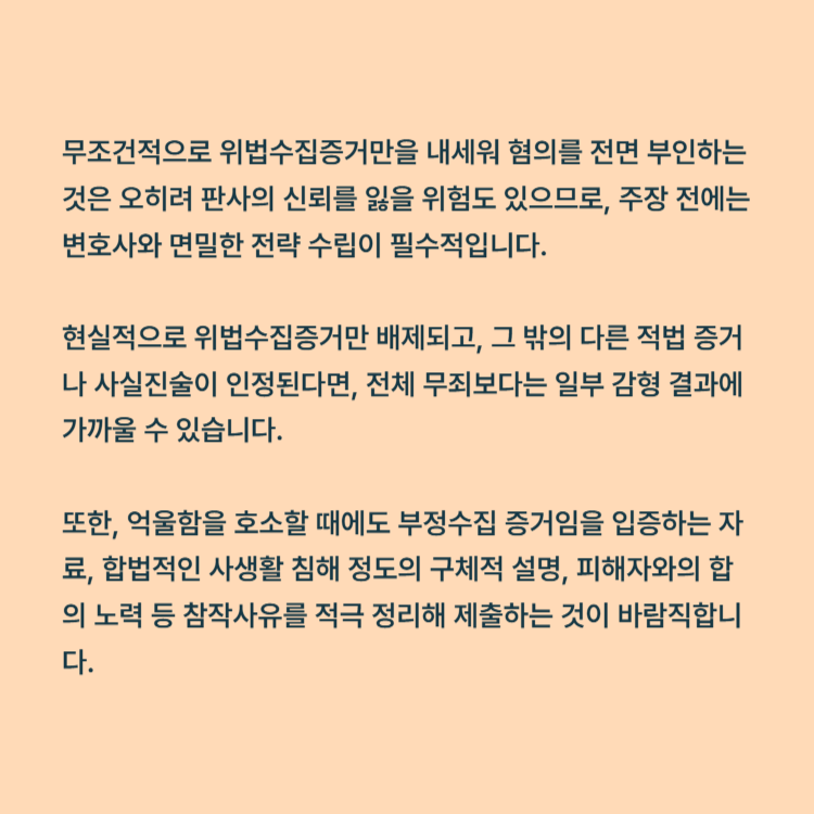 무조건적으로 위법수집증거만을 내세워 혐의를 전면 부인하는 것은 오히려 판사의 신뢰를 잃을 위험도 있으므로, 주장 전에는 변호사와 면밀한 전략 수립이 필수적입니다.