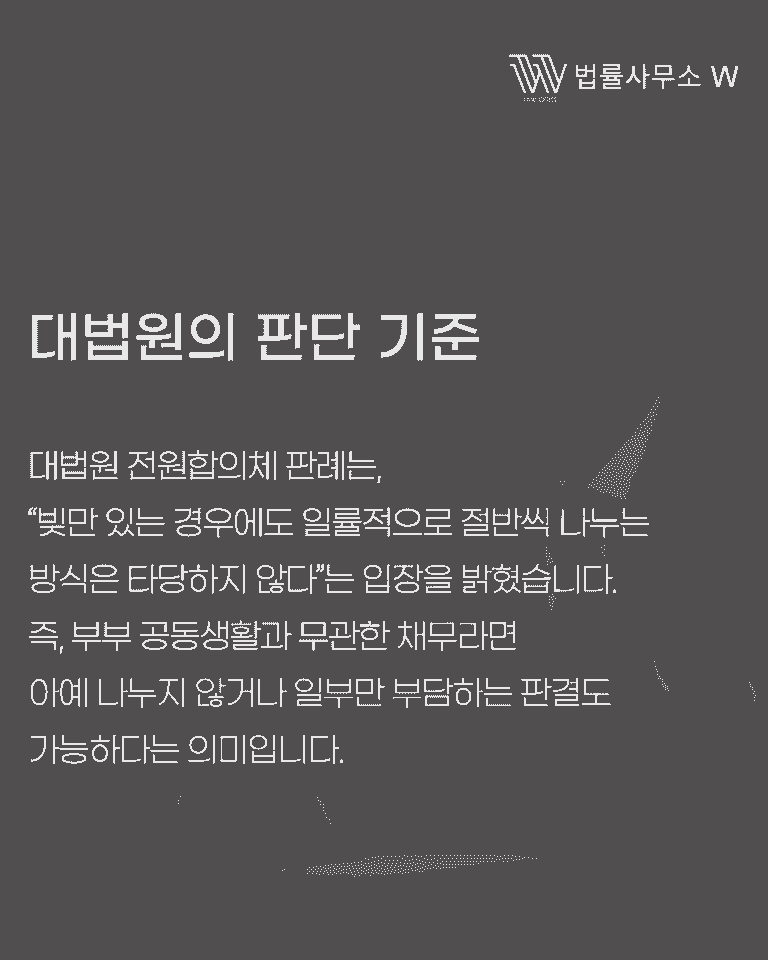 대법원 전원합의체 판례는, “빚만 있는 경우에도 일률적으로 절반씩 나누는 방식은 타당하지 않다”는 입장을 밝혔습니다. 즉, 부부 공동생활과 무관한 채무라면 아예 나누지 않거나 일부만 부담하는 판결도 가능하다는 의미입니다.
