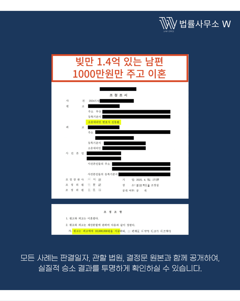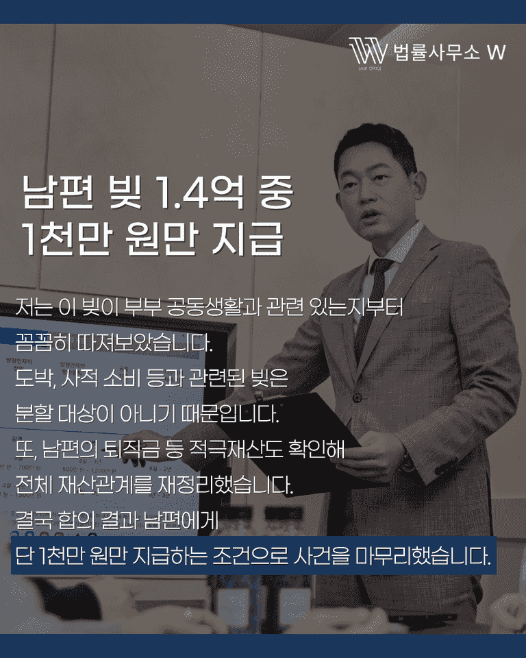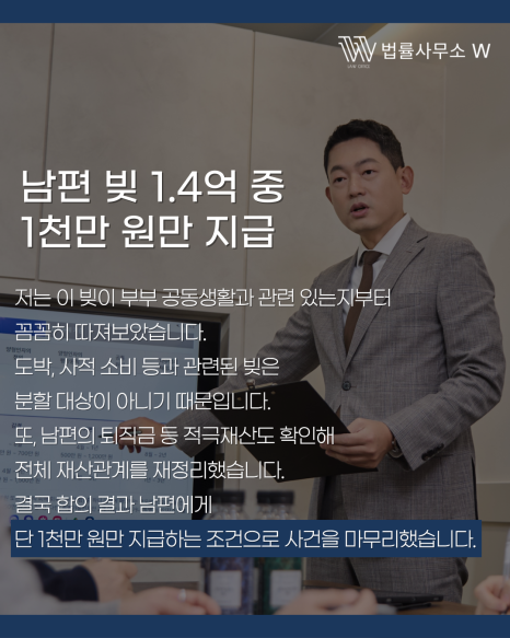 조정 과정에서 아내가 남편 빚을 전부 나눠야 할 합리적 이유가 없다는 점을 강력히 주장했고, 결국 합의 결과 남편에게 단 1천만 원만 지급하는 조건으로 사건을 마무리했습니다.