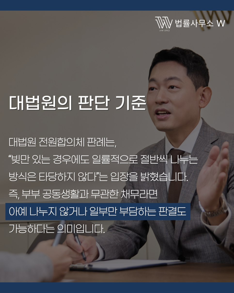 따라서 단순히 계산식으로만 나누지 않고, 채무 발생 경위와 사용처, 혼인 파탄 책임, 상대방의 보유 자산 등을 종합적으로 고려합니다.