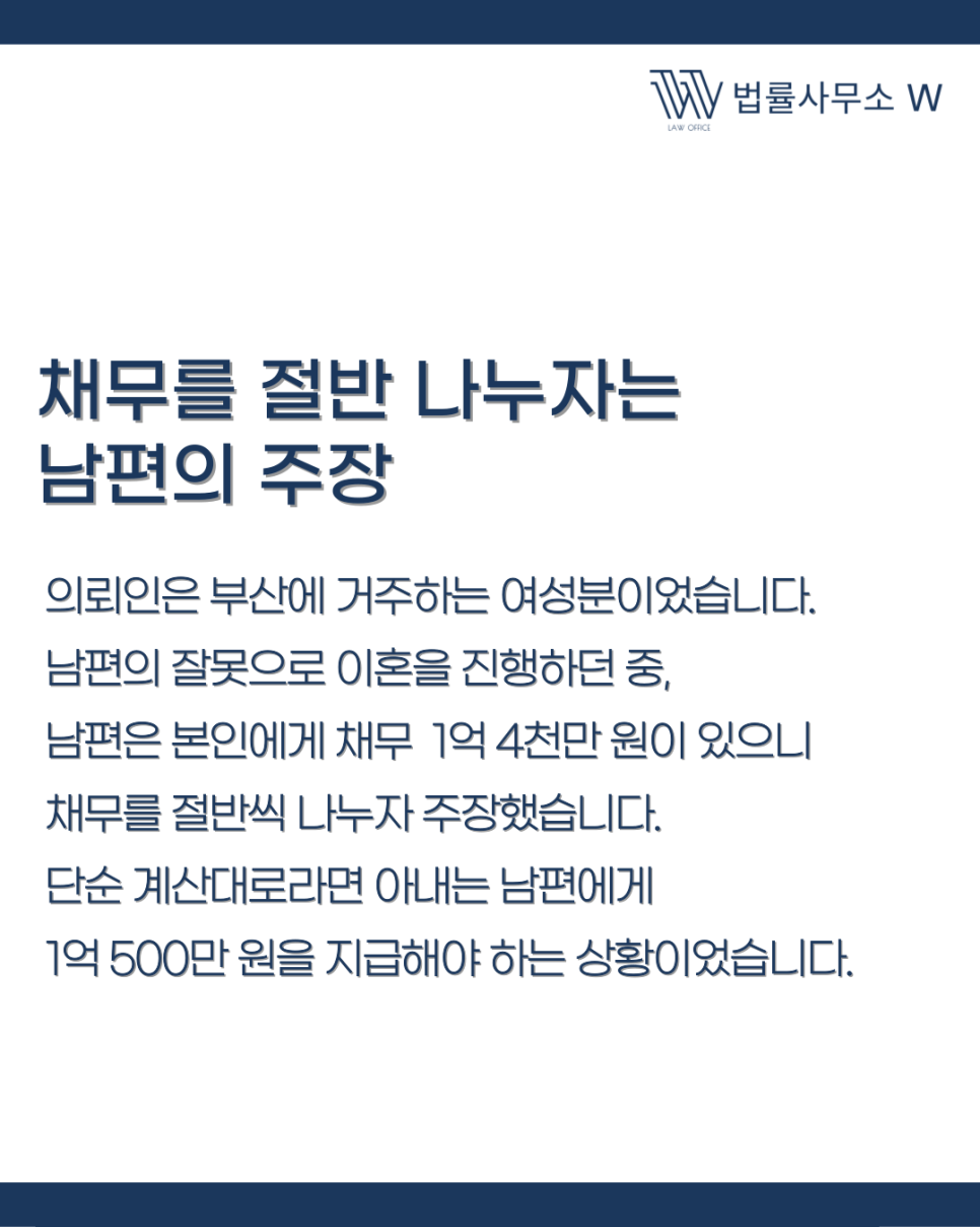오늘 소개할 사건의 의뢰인은 부산에 거주하는 아내였습니다. 남편의 잘못으로 이혼을 진행하던 중, 남편은 본인에게 채무 1억 4천만 원이 있고 아내에게는 +7천만 원의 재산이 있다며 채무를 절반씩 나누자고 주장했습니다. 단순 계산대로라면 아내는 남편에게 1억 500만 원을 지급해야 해서, 가지고 있던 재산 대부분을 잃을 위기에 처했습니다.