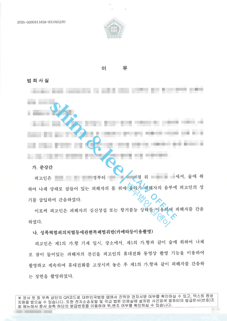 1) 술에 취해 잠든 피해자를 몰래 간음한 점과 2)카메라의 위치를 의도적으로 조정해 피해자의 나체와 성관계 장면을 촬영한 점은 각각 준강간죄와 카메라이용촬영죄에 해당한다고 주장하였습니다.
