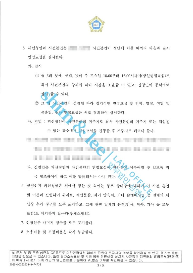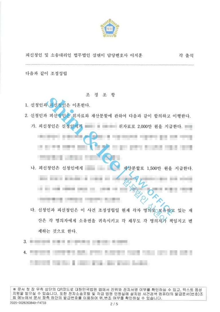 심앤이는 의뢰인과 오랜 고민 끝에 이혼에 동의하기로 결정했고, 배우자의 요구 금액을 조정하여 위자료 2,000만 원 재산분할 1,500만 원으로 합의하였습니다. 그리고 면접 교섭은 월 3회, 회당 6시간씩 진행하기로 했으며, 각자 명의로 보유하고 있는 재산은 해당 명의자에게 귀속시키고, 각 채무 역시 해당 명의자가 책임지고 변제하기로 하여 재산 관계도 명확히 정리하여 더 이상 불필요한 갈등으로 번지지 않고 원만히 마무리될 수 있도록 조정하였습니다.