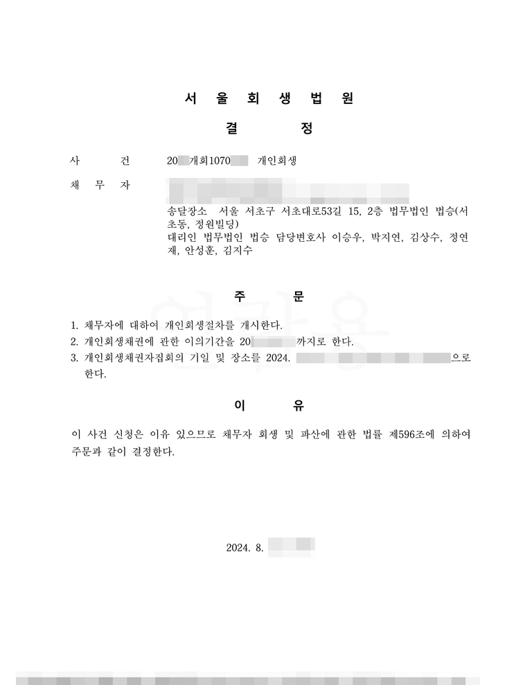 결국 총 채무가 약 1억 1,400만 원에 이르게 되었고, 의뢰인은 이러한 상황을 감당할 수 없다고 판단하여 법무법인 법승 회생팀에 사건을 의뢰하였습니다.
