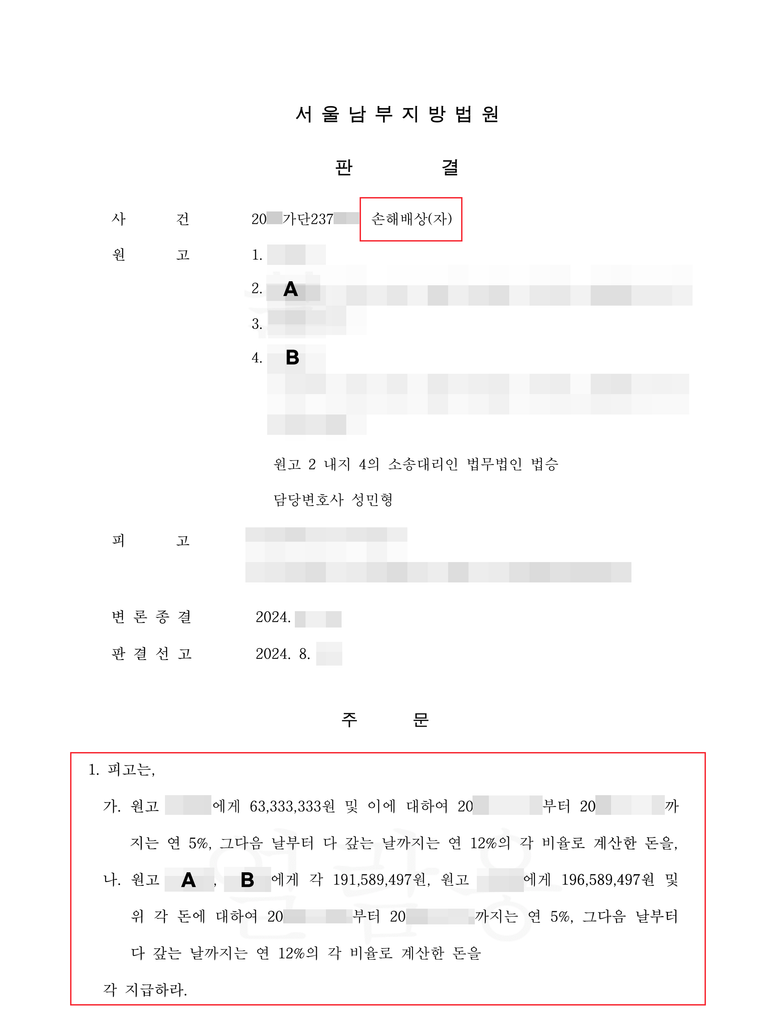 위자료로만 1억 7,500만 원이 판결되었으며, 이를 포함하여 의뢰인들에게 약 5억 8천만 원의 손해배상금이 인용되었습니다.