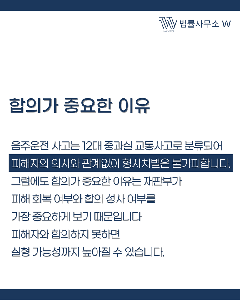 음주운전은 ‘12대 중과실 교통사고’에 해당합니다. 이 때문에 피해자의 처벌 의사와 관계없이 형사처벌이 이루어지지만, 합의 여부는 양형에 있어 가장 큰 영향을 미칩니다.