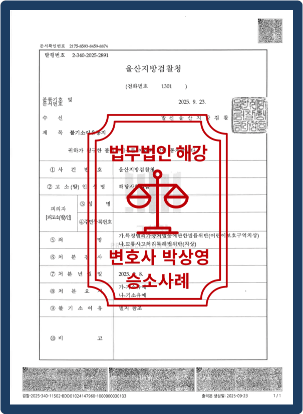 의뢰인은 울산 남구 ○○초등학교 후문 어린이보호구역에서 아침 출근길에 차량을 운전하다가 횡단보도를 건너던 어린이와 접촉 사고를 일으켰습니다. 피해 아동은 요추 염좌 등으로 약 2주간의 치료를 요하는 상해를 입었고, 피의자에게는 특정범죄가중처벌법 위반(어린이보호구역 치상) 및 교통사고처리특례법 위반(치상) 혐의가 적용되었습니다. 어린이보호구역 교통사고 사건은 법정형이 매우 무겁고 사회적 파장이 큰 만큼, 피의자와 가족 모두 극심한 불안을 겪을 수밖에 없었습니다.