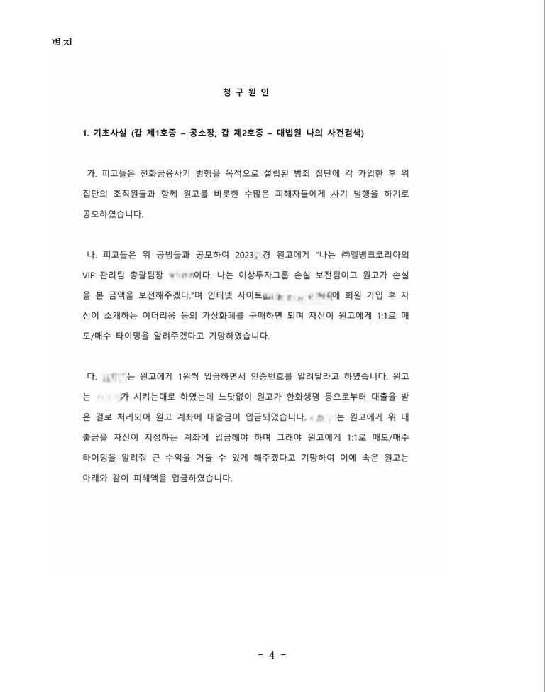 저는 즉각 가해자들을 피고로 하여 민사소송 불법행위 손해배상청구를 하였고 법원은 원고 승소 판결을 선고하여 의뢰인은 피해액을 반환받았습니다.
