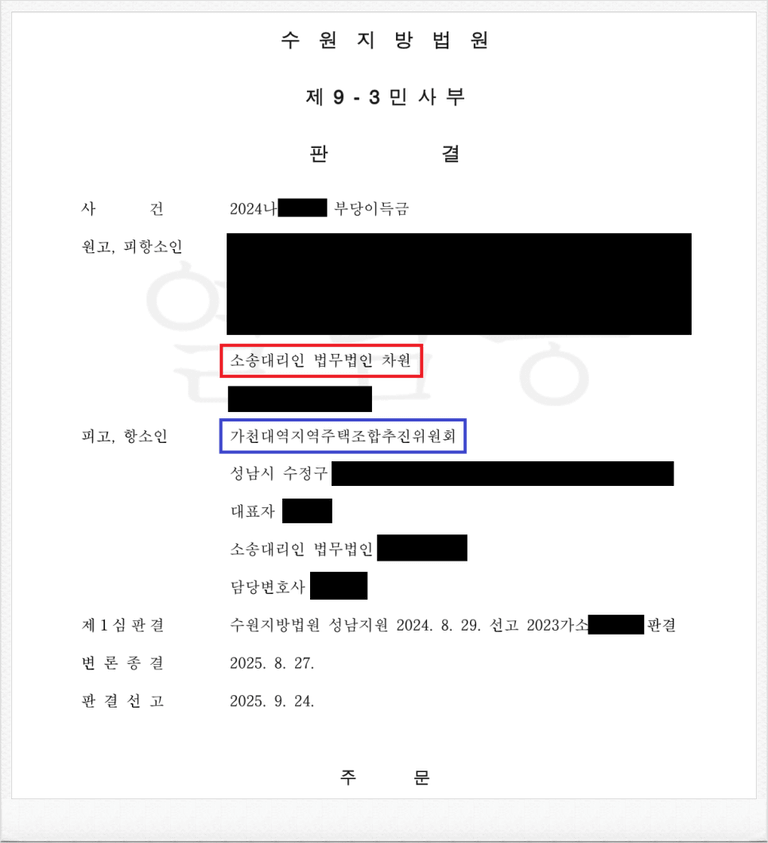 그러나, 가입 이후 피고 가천대역지역주택조합 추진위원회의 사업이 계획대로 진행되지 않았고, 이에 의뢰인께서는 민사소송을 제기하여 기납입한 금원의 반환을 구하고자 하셨습니다.