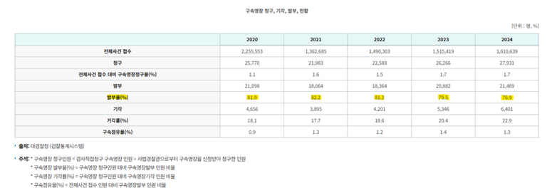 구속영장 발부율을 보면, 최근 나라에서 발표한 지표에 따르면 지난 5년간 평균 약 80%에 달하는 높은 비율을 기록하고 있습니다.