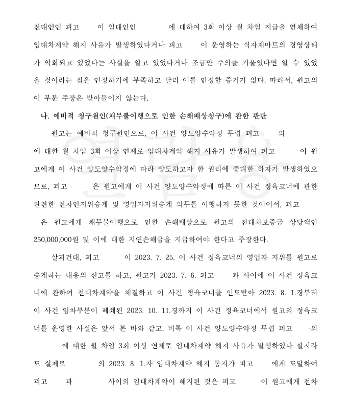 영업양수인을 대리한 저는 영업양도 계약 이행이 정상적으로 되었고, 영업양수인은 정상적으로 임대인에게 보증금을 반환받았을 뿐 아니라 별다른 임대인의 자력악화 사실을 알 수 없었다는 점을 증명하여 채무불이행이나 불법행위에 기한 손해배상책임이 없음을 주장하였습니다. 재판부에서는 그러한 영업양수인의 입장을 인정하여 원고의 주위적, 예비적 청구를 모두 기각하였습니다.