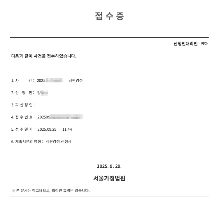 [의뢰현황] 2025년 9월 29일 양**님 심판경정 신청 사건위임