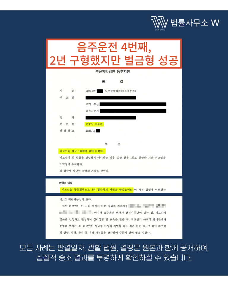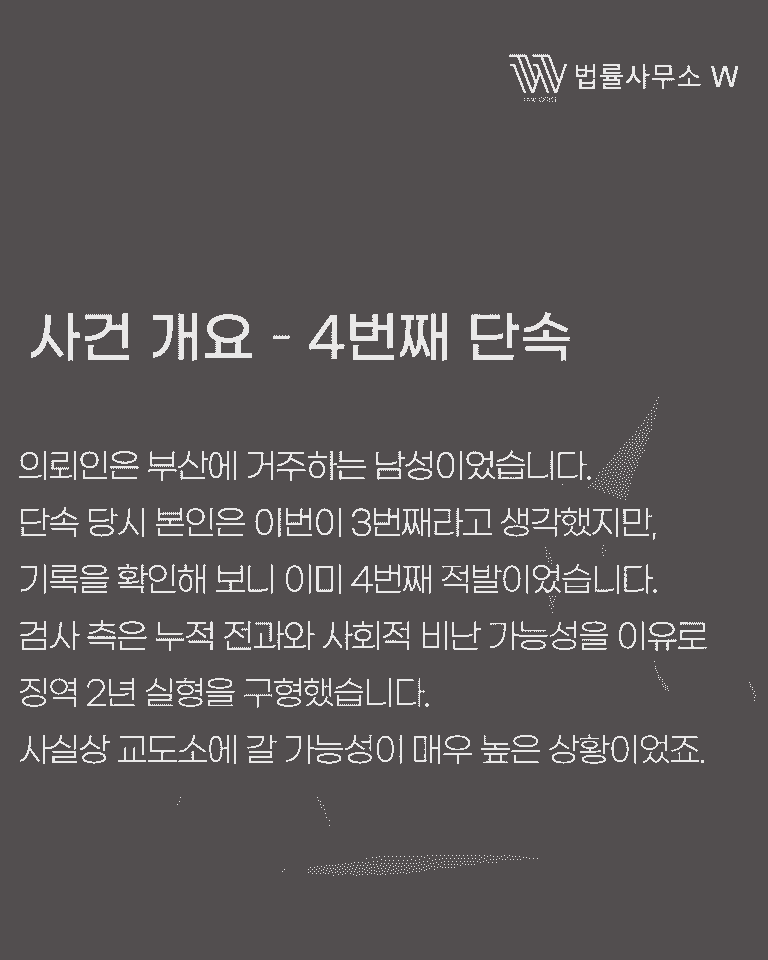 의뢰인은 부산에 거주하는 남성이었습니다. 단속 당시 본인은 이번이 3번째라고 생각했지만, 기록을 확인해 보니 이미 4번째 적발이었습니다.