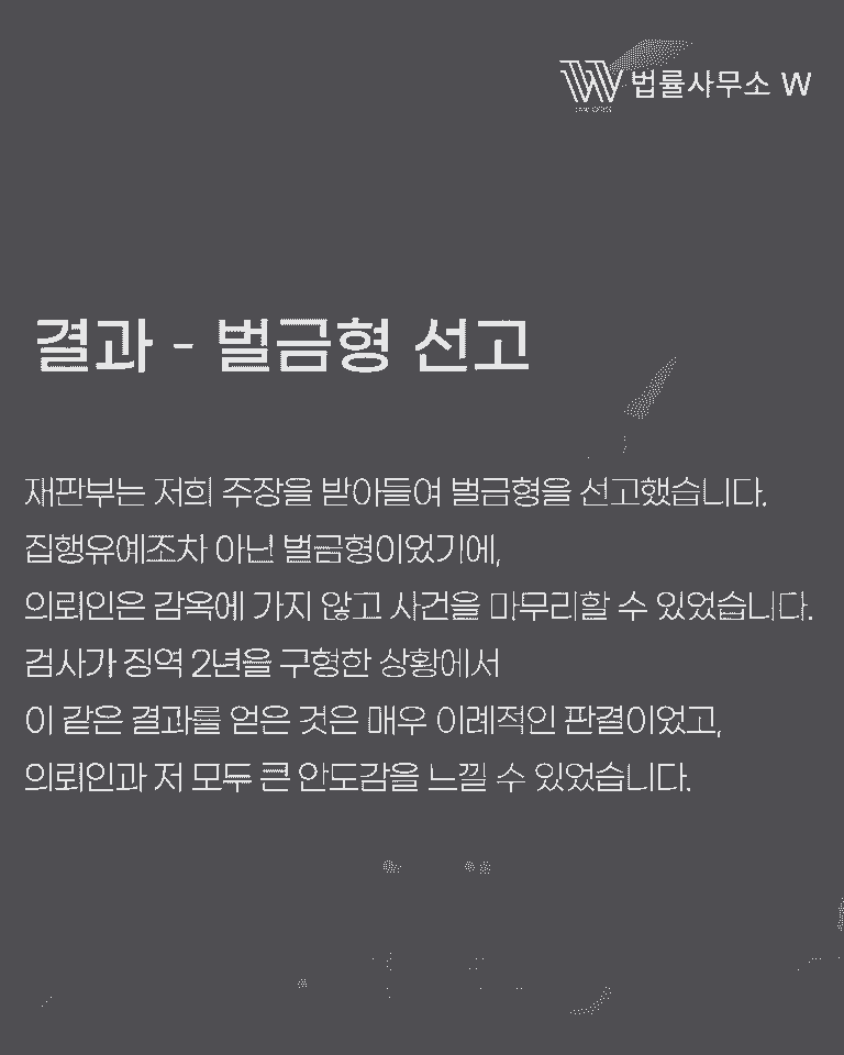 결국, 재판부는 저희 주장을 받아들여 벌금형을 선고했습니다. 집행유예조차 아닌 벌금형이었기에, 의뢰인은 감옥에 가지 않고 사건을 마무리할 수 있었습니다. 검사가 징역 2년을 구형한 상황에서 이 같은 결과를 얻은 것은 매우 이례적인 판결이었고, 의뢰인과 저 모두 큰 안도감을 느낄 수 있었습니다.