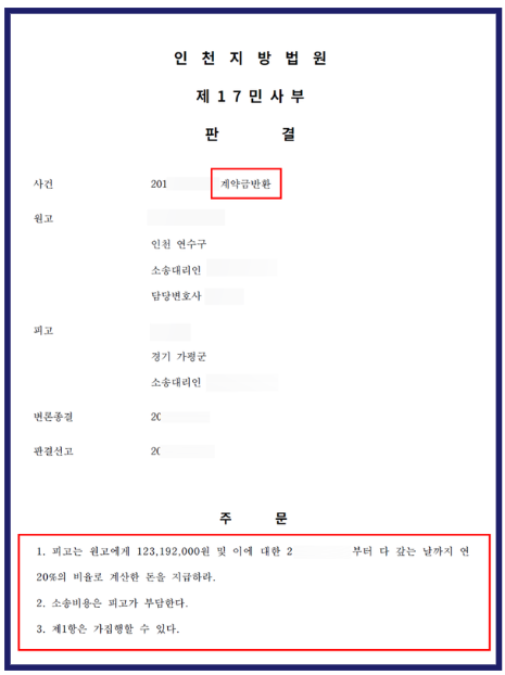 결국 원고는 법률 검토 끝에 임대수익률 보장을 내세운 허위 광고에 기초한 계약이라 판단하고 분양대금 반환을 청구하는 소송을 제기했습니다.