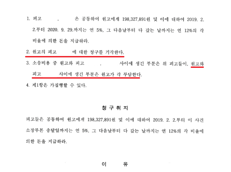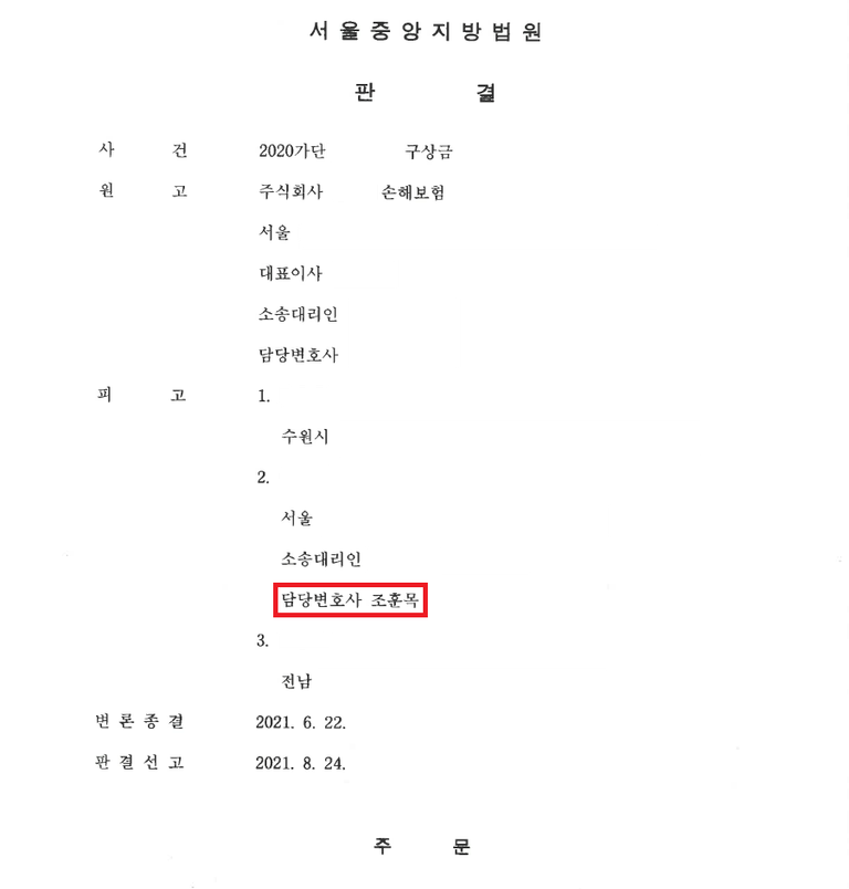 다행히도 당시 사건을 담당하였던 서울중앙지방법원은 위 피고의 주장을 전부 받아들여 보험회사의 의뢰인에 대한 구상금 청구를 전부 기각하는 판결을 내렸습니다.