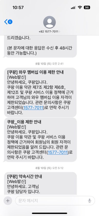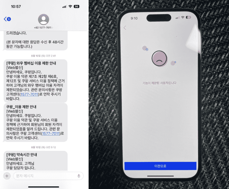 반품 미회수 통지가 반복되다가, 쿠팡측은 2024. 8. 10. 02:41 김정기 변호사를 '반품 미회수' 이유로 영구정지처분하였습니다.