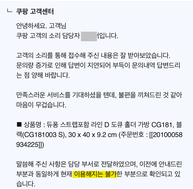 그러나 쿠팡은 다른 이유는 제시하지 않고, 무작정 영구이용정지 해제는 불가능하다는 답변만 반복하였습니다.