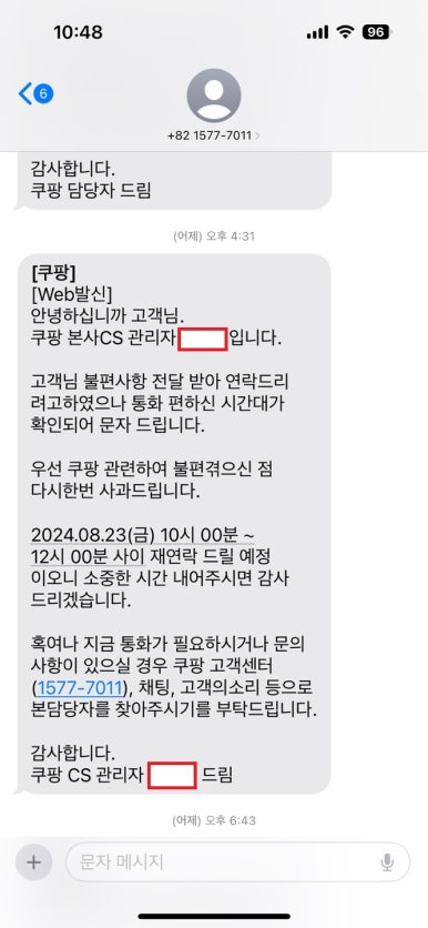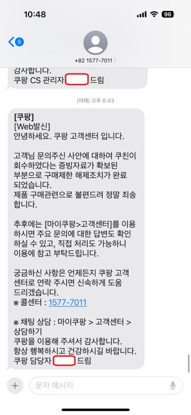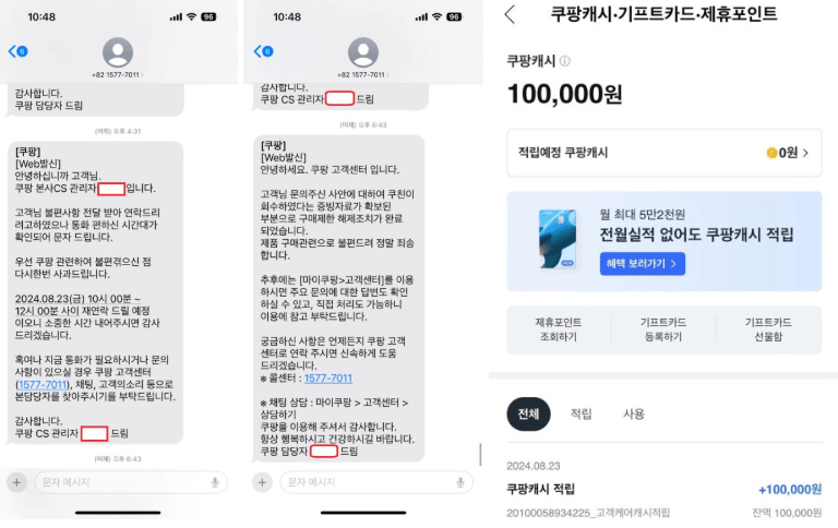 쿠팡측은 본사 관계자와는 절대 통화할 수 없다는 기존 입장을 번복하고, 본사 CS관리부서에서 김정기 변호사에게 먼저 연락하여 명시적 사과를 하였고, 사과의 의미로 쿠팡캐시 10만 원을 김정기 변호사에게 지급하였습니다.