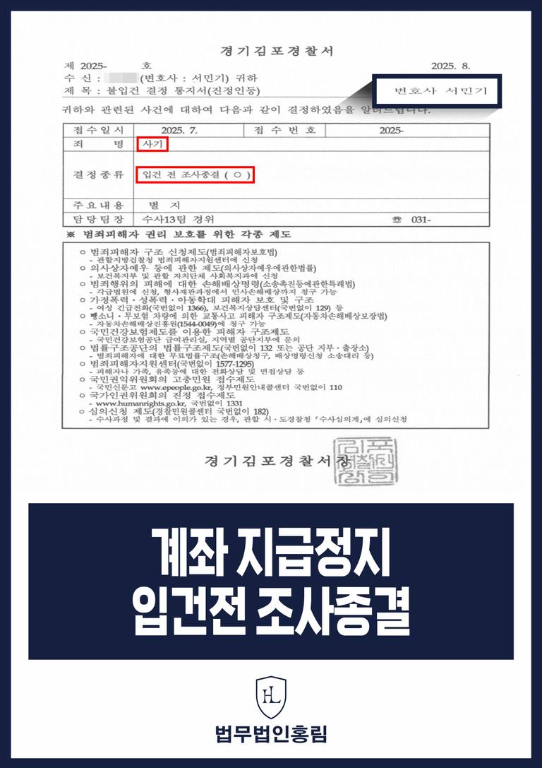 변호인의 이와 같은 적극적인 변론과 철저한 증거 제출 덕분에, 수사기관은 의뢰인이 보이스피싱 범죄와 직접적인 관련이 없다고 판단했습니다. 결국 의뢰인은 입건 전 조사 종결 처분을 받아 형사 처벌의 위기에서 벗어날 수 있었습니다. 이 이후 금융기관에 불입건 종결서를 제출하여 계좌 지급 정지 또한 해제 되었습니다.