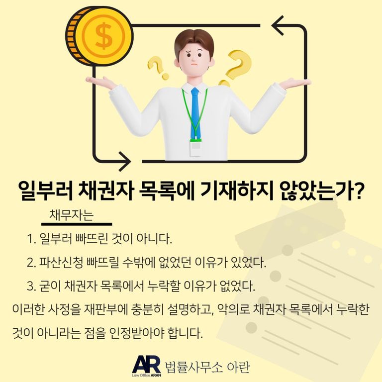 이때 채무자는 아래의 사정을 충분히 재판부에 설명하고, 악의로 채권자 목록에서 누락한 것이 아니라는 점을 인정받아야 합니다.
