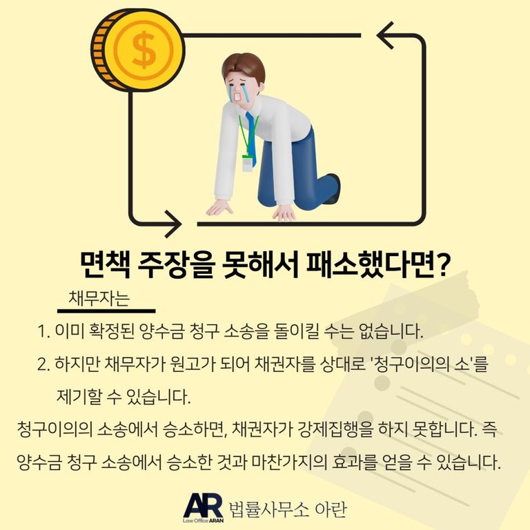 만약 양수금 소송의 패소 판결이 확정되어 버렸다면, 채무자에게 남은 마지막 기회는 채무자가 원고가 되어 양수금 소송의 채권자를 상대로 '청구 이의의 소'를 제기하는 것입니다.