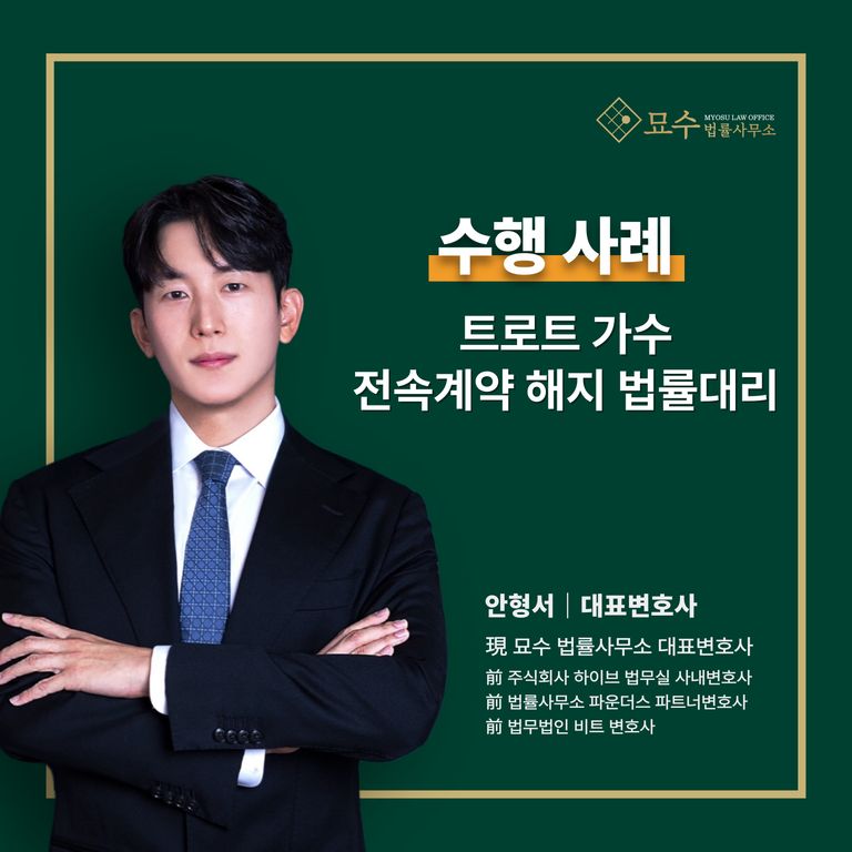 전속계약 문제로 법적인 도움이 필요하시다면, 엔터 전문 변호사인 안형서 변호사의 조력을 받아 안전하게 권리를 보호하시고 창작 활동을 이어가시길 바랍니다.