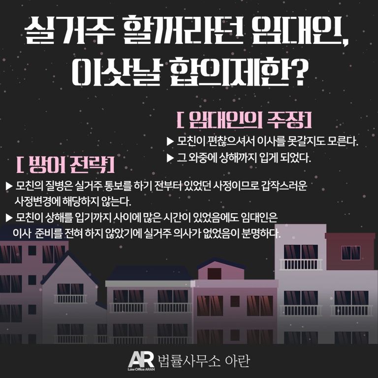 모친의 상해에 대해서는, 의뢰인의 이사 후 모친이 상해를 입기까지 사이에 수개월의 시간이 있었음에도 불구하고 임대인이 이사 준비를 전혀 하지 않았던 점에 비추어볼 때 실거주 의사가 없었음이 분명하다