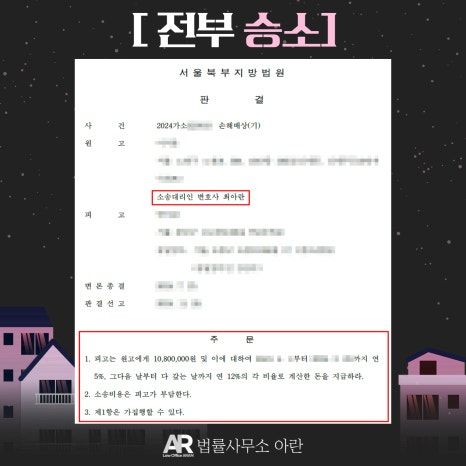 그 결과, 의뢰인은 전부 승소 판결을 받았습니다. 이후 임대인으로부터 손해배상금액과 소송비용까지 회수하면서 사건이 마무리되었습니다.