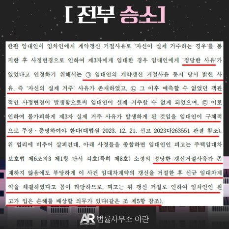 법원에서는 최아란 변호사의 주장을 전부 받아들였습니다. 즉 임대인이 주장하는 사유는 '실거주한다던 임대인이 제3자에게 임대할만한 정당한 사유에 해당하지 않는다'라고 본 것입니다.