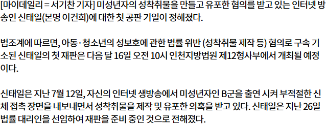 BJ 신태일이 방송 도중 긴급체포되었습니다. 미성년자 성착취물을 제작한 혐의인데요. 초기에는 BJ 신태일에 대해서만 수사를 진행하는 것처럼 알려졌지만, 최근에는 인천서부경찰서에서 BJ 신태일의 방송을 시청하며 후원한 사람들에 대해서까지 성착취물제작등방조 혐의로 입건하여 수사를 진행하고 있습니다.