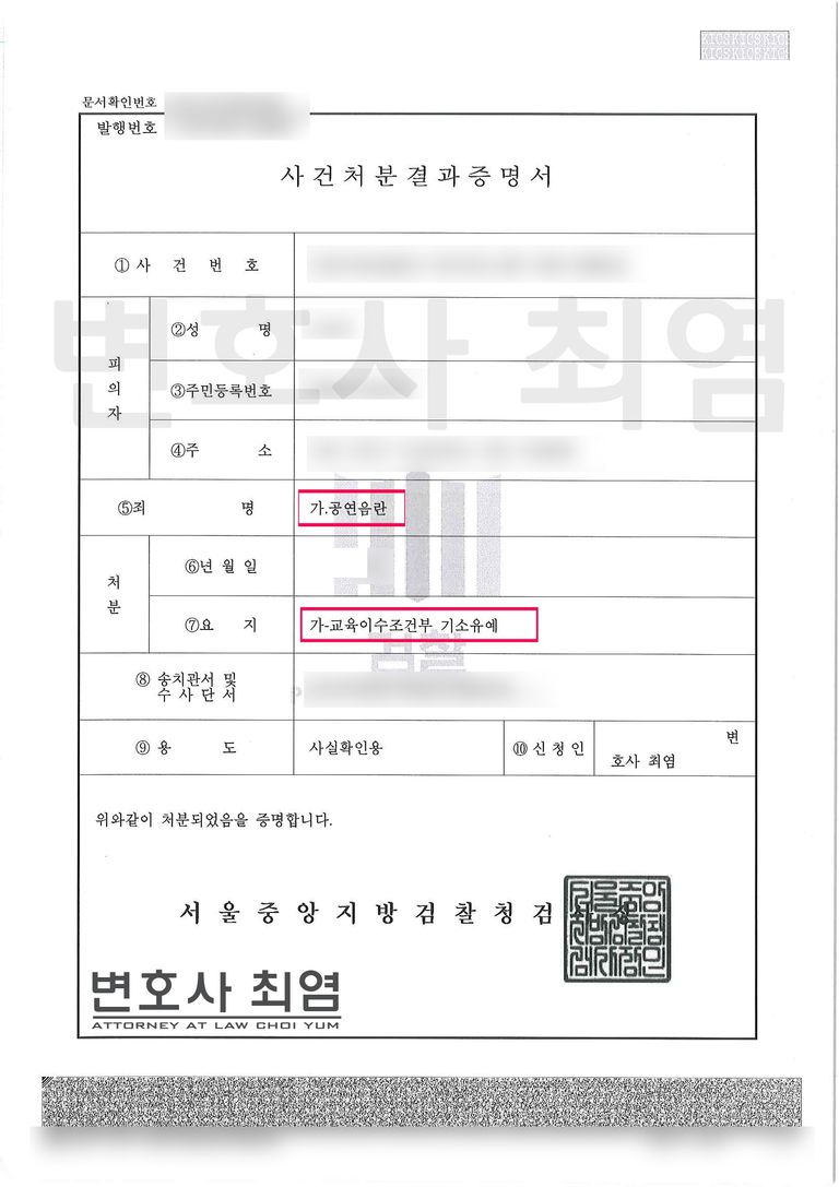검찰은 의뢰인의 사정을 종합적으로 고려하여 교육조건부 기소유예 처분을 내렸습니다.