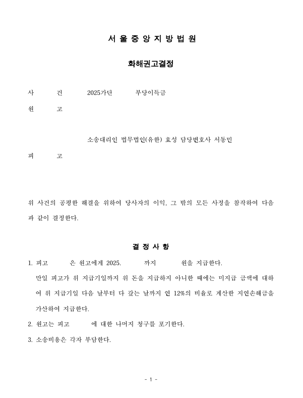 저는 즉각 입금 받은 자를 피고로 하여 민사소송 부당이득반환청구소송을 제기하였고 법원은 피고가 원고에게 청구액을 지급하는 내용의 화해권고결정을 내려 확정되어 의뢰인은 피해액을 반환받았습니다.
