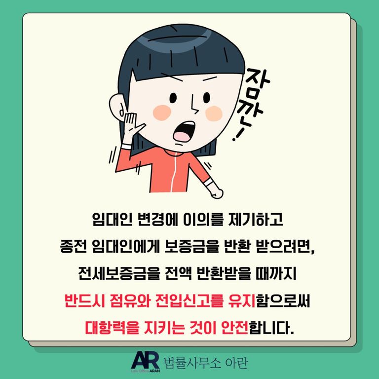 즉 임대인 변경에 이의를 제기하고 종전 임대인에게 보증금을 반환받을 요량이라면, 전세보증금을 전액 반환받을 때까지 반드시 점유와 전입신고를 유지함으로써 대항력을 지키는 것이 안전합니다.