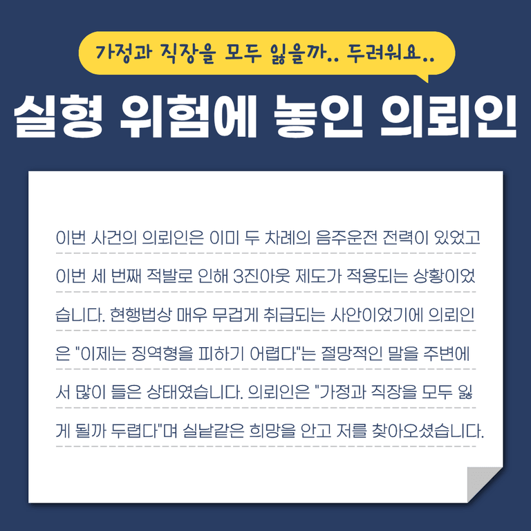 음주운전 3회 적발: 실형 위험에 놓인 의뢰인