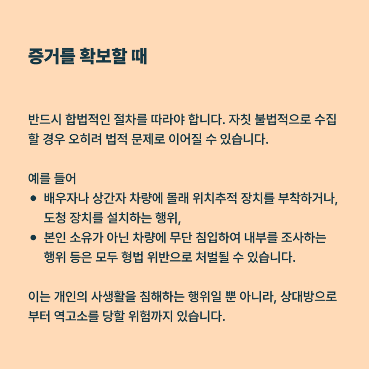 증거를 확보할 때는 반드시 합법적인 절차를 따라야 합니다. 자칫 불법적으로 수집할 경우 오히려 법적 문제로 이어질 수 있습니다.
