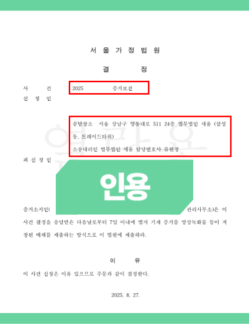 이에 저희는 사건 인수 직후 신속히 신청서를 제출했고, 특히 타인의 사생활 침해를 최소화하면서도 증거 확보의 필요성을 강조하는 방식으로 준비했습니다. 그 결과, 신청 후 단 하루 만에 인용 결정을 받아낼 수 있었습니다.