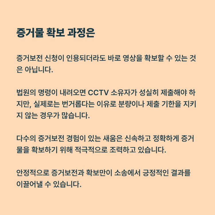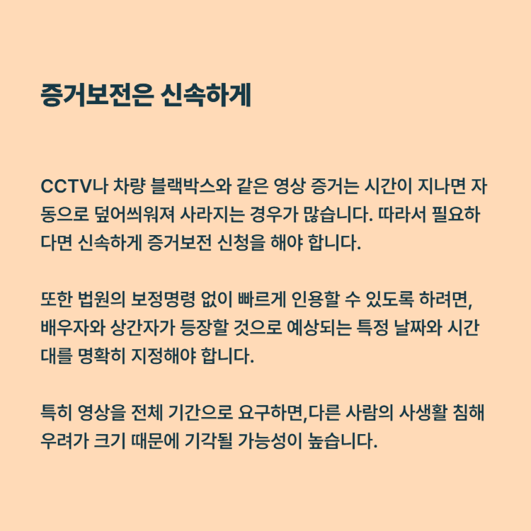 CCTV나 차량 블랙박스와 같은 영상 증거는 시간이 지남에 따라 자동으로 덮어씌워져 사라질 수 있습니다. 따라서 필요하다면 지체 없이 보전 신청을 해야 합니다.