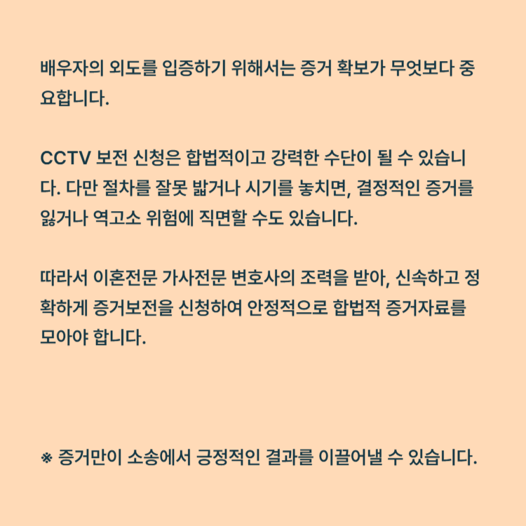 배우자의 외도를 입증하기 위해서는 증거 확보가 무엇보다 중요합니다. 그중에서도 CCTV 보전 신청은 합법적이고 강력한 수단이 될 수 있습니다. 다만 절차를 잘못 밟거나 시기를 놓치면, 결정적인 증거를 잃거나 역고소 위험에 직면할 수도 있습니다.