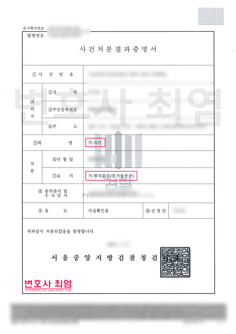검찰은 변호인의 주장을 받아들여 의뢰인의 행위가 보이스피싱 범죄라는 점을 인식했다고 보기 어렵고 주장을 배척할 만한 증거도 부족하다며 혐의없음 불기소처분을 내렸습니다.