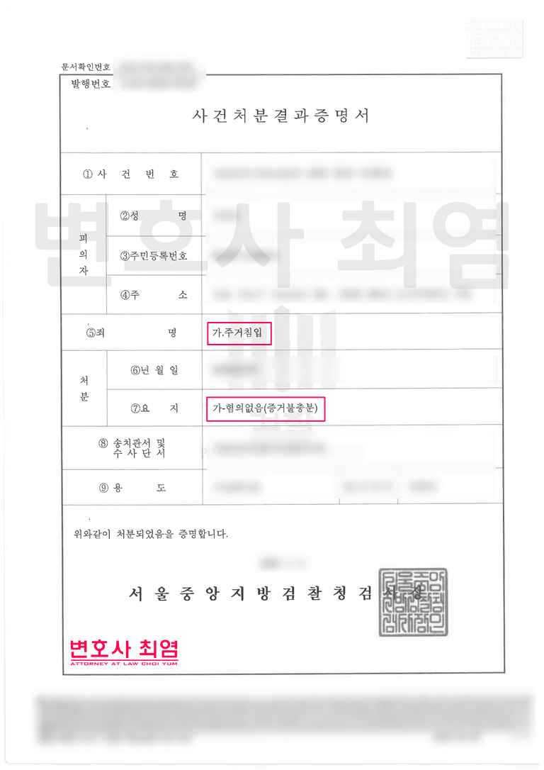 검찰은 변호인의 주장을 받아들여 주거침입 혐의를 인정할 명확한 증거가 없다고 보아 의뢰인에게 혐의없음 불기소처분(증거불충분)을 내렸습니다.